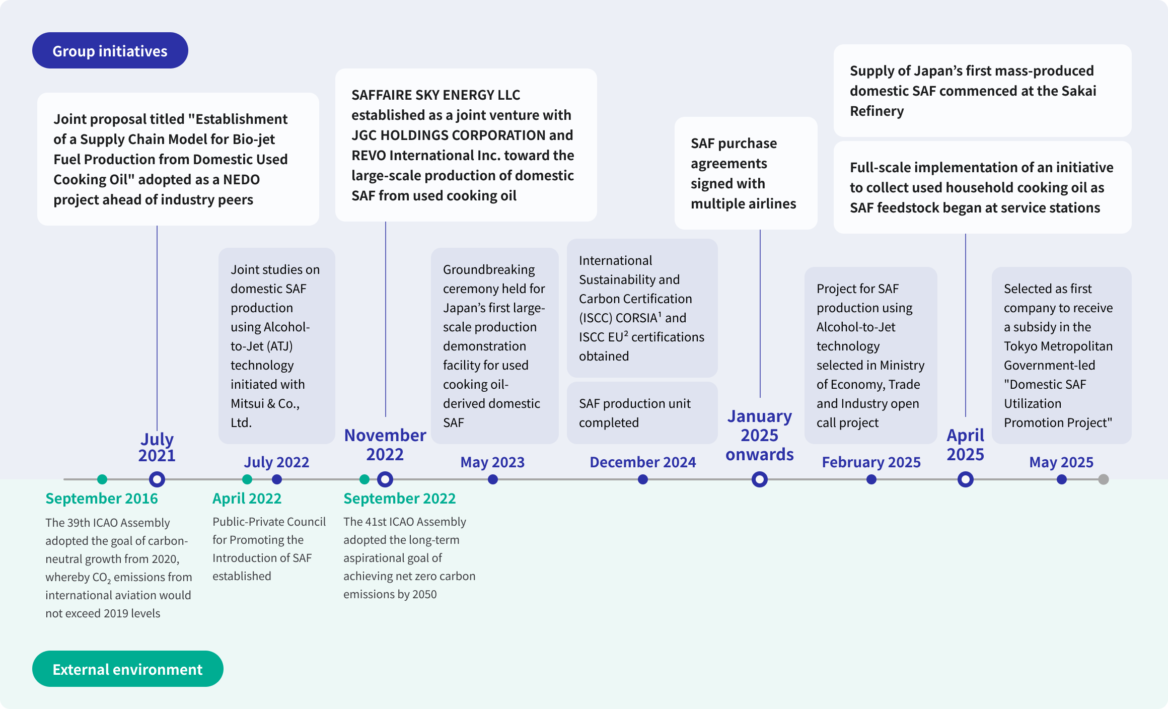 In 2021, the Group, together with JGC HOLDINGS CORPORATION and REVO International Inc., submitted a joint proposal for an open call project to the New Energy and Industrial Technology Development Organization (NEDO) titled "Establishment of a Supply Chain Model for Bio-jet Fuel Production from Domestic Used Cooking Oil," which was subsequently adopted. Building on this milestone, the Group became an industry pioneer in advancing domestic SAF supply, and in April 2025 began supplying Japan’s first mass-produced domestic SAF. By bringing together the expertise and assets cultivated over many years across our respective businesses, we successfully established an end-to-end supply chain covering everything from feedstock procurement to SAF production and its supply to airlines. Looking ahead, we will accelerate efforts to establish a domestic SAF supply chain while diversifying feedstocks and production processes, including exploring bio-ethanol-derived SAF production using Alcohol-to-Jet (ATJ) technology.2