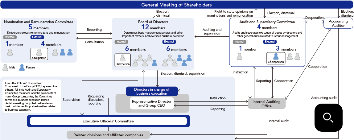 The Company’s Board of Directors consists of eight directors who are not Audit and Supervisory Committee members (five men including one independent outside director, and three women including two independent outside directors) and four directors who are Audit and Supervisory Committee members (including three men serving as internal director, one man serving as independent outside director, and one woman serving as independent outside director). The Board is responsible for making decisions on important matters such as basic management policies and overseeing business execution. To strengthen its supervisory function and ensure that management is fair and transparent, we have appointed six independent outside directors. We have also established a system whereby information required by those directors is immediately reported.
