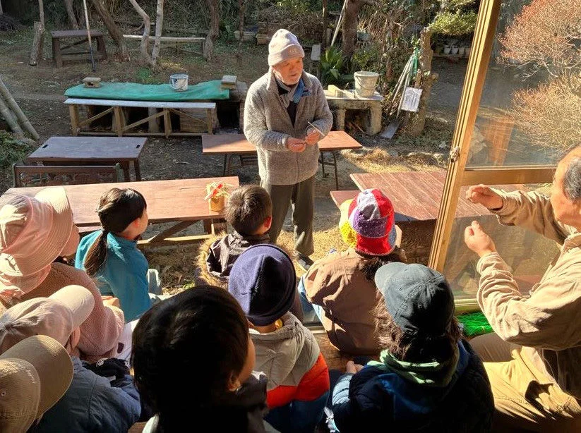子どもたちの大活躍のおかげで、稚樹を無事レスキューできました。最後は北風が入らない場所に集まり、ドングリと森の生き物の紙芝居を読み聞かせして、活動を終えました。