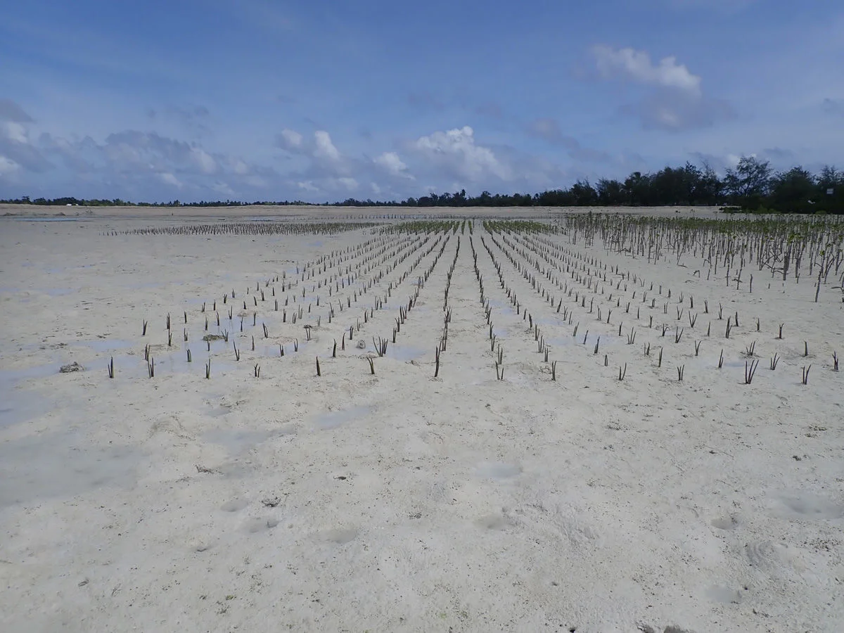 右隣と奥には過去に植林したマングローブが写っており、緑の葉をつけて成長している様子がうかがえます。