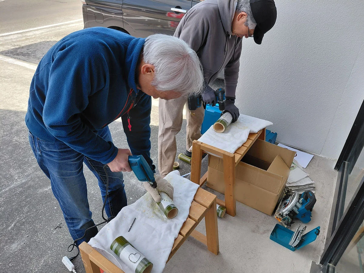 午前は竹灯籠作り。電動ドリルで図案通りに穴を開け、LEDで安全に楽しめる幻想的な明かりを製作しました。