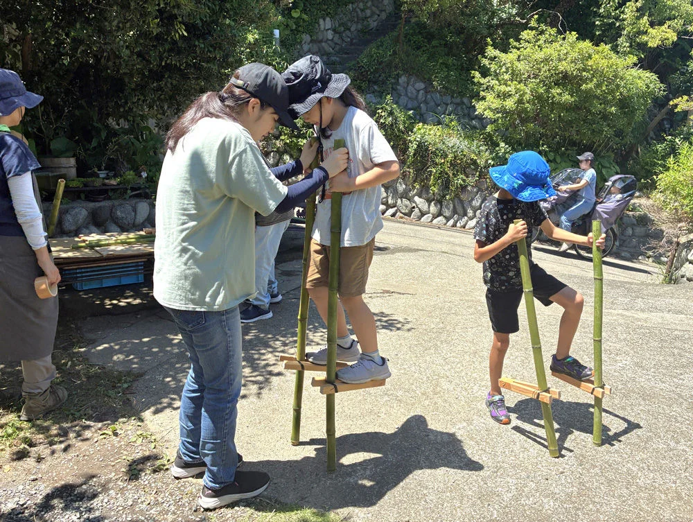 昔遊び伝道師の指導のもと、竹馬、紙デッポウ、竹笛、そうめん流し台など、竹を使ってゼロから作り、遊びや食へと展開させました。
