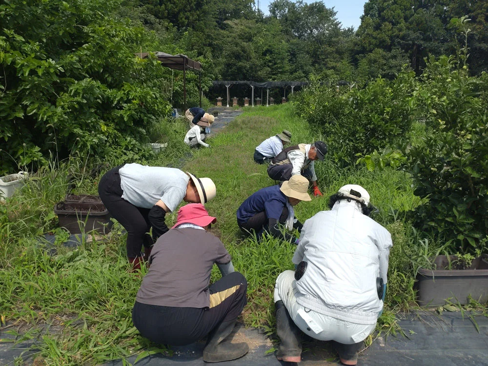 ワークショップでは、蜜源となるひまわりの栽培に取り組みました。猛暑により遊休農地の土も乾燥し、発芽率も低いため、除草をして新たな種をまきました。