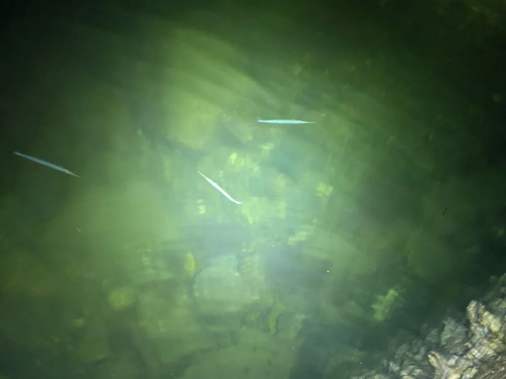 夜間、塩性湿地周辺の生き物を観察してみるとサヨリの幼魚が群れていました。