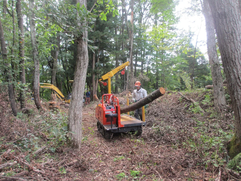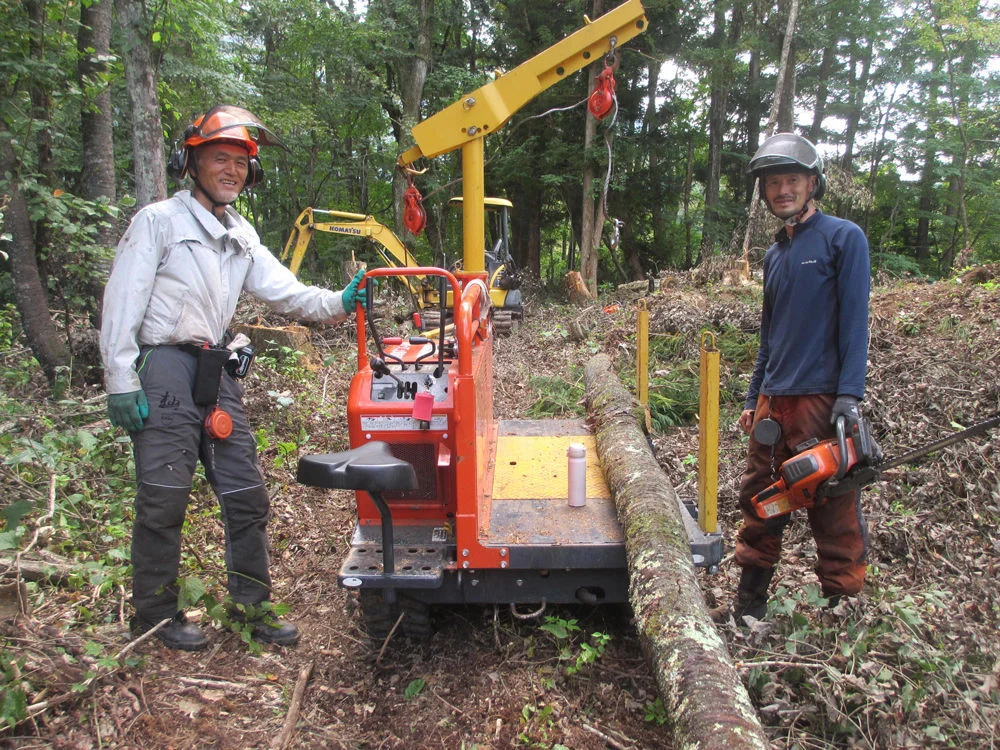「鬼無里の森を守り隊」メンバーが小さな機械(林内作業車とバックホー)を工夫して使い、ナラの原木を集材・搬出しました。