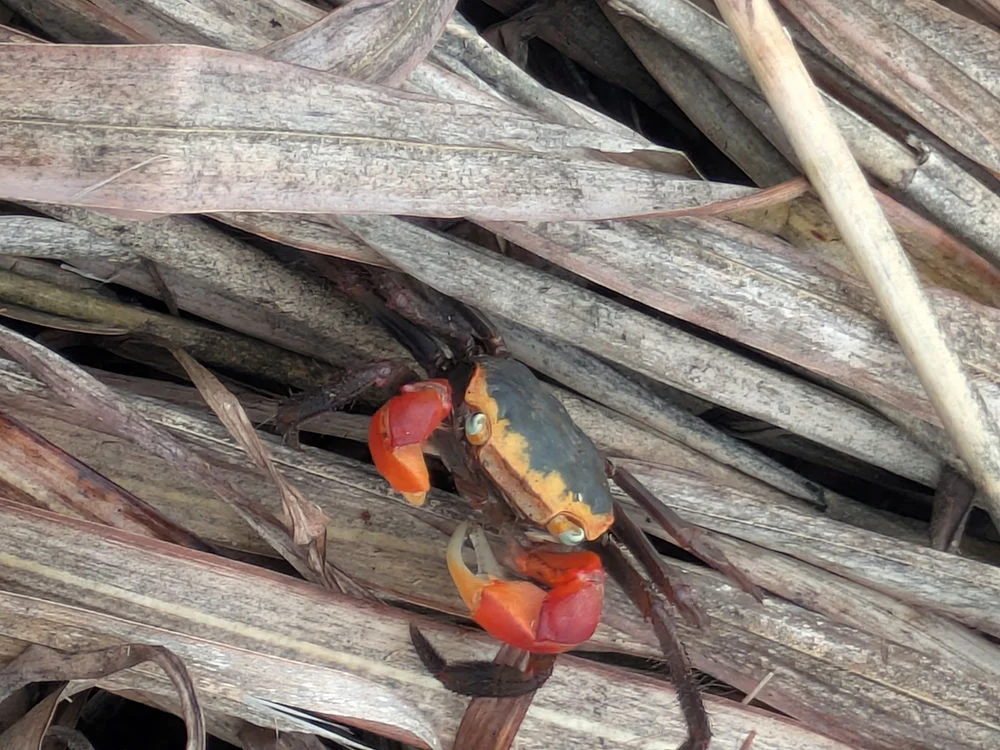 足元からは「カサカサ」とカニの歩く音が全面的に聞こえてきます。やはり今年は「当たり年」のようで、アカテガニやアシハラガニがとても多く見られました。陸生のカニは他にクロベンケイガニ、ベンケイガニ、サワガニも生息しています。これらのカニ類は海から森までグラデーションがある自然環境が必要ですので、今後も生物を観察しながら生態系を管理していこうと思います。