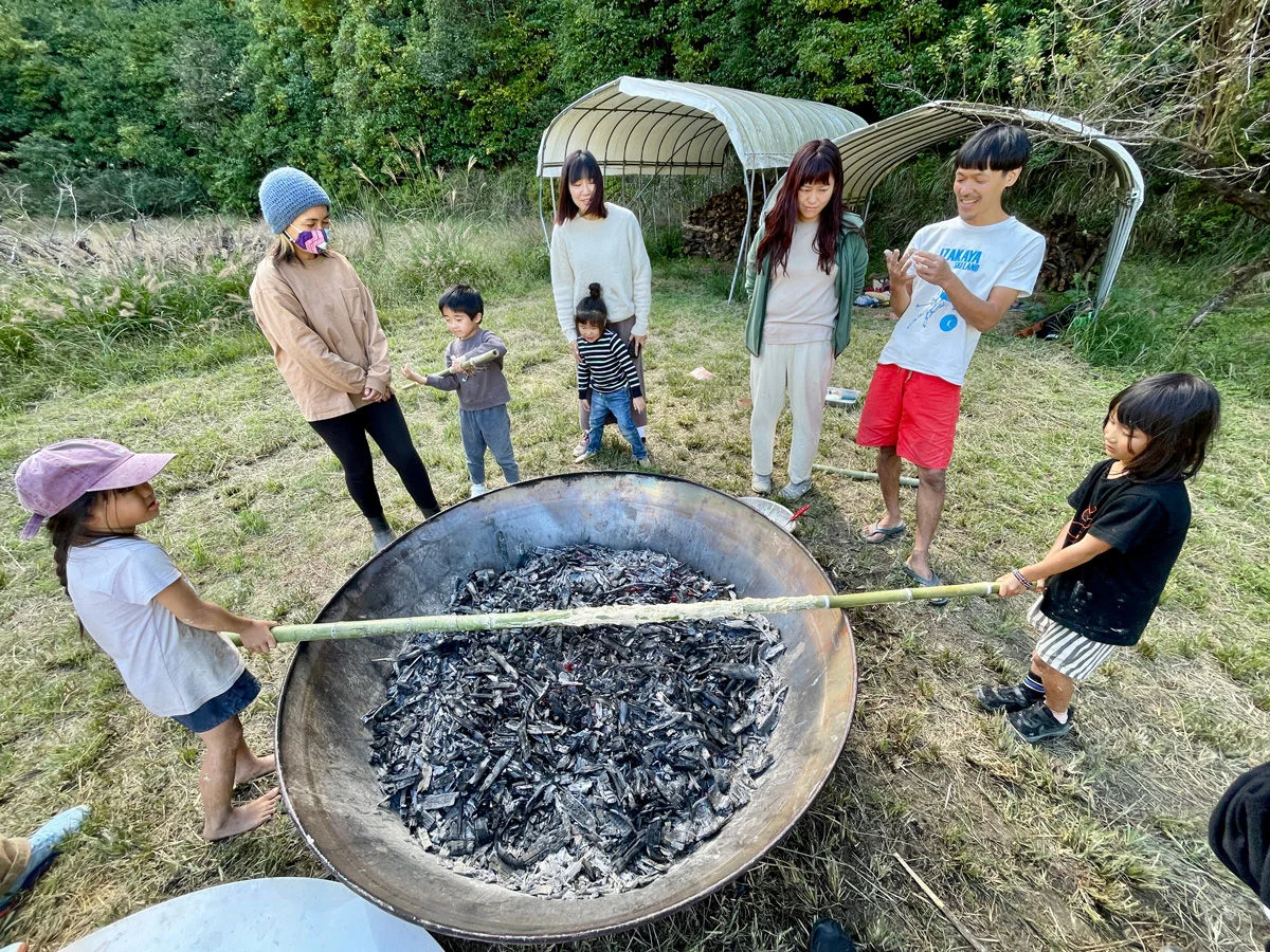 「森のようちえん」の皆さまとバウムクーヘンを作りました。一日かけて、竹炭をつくるところから行いました。