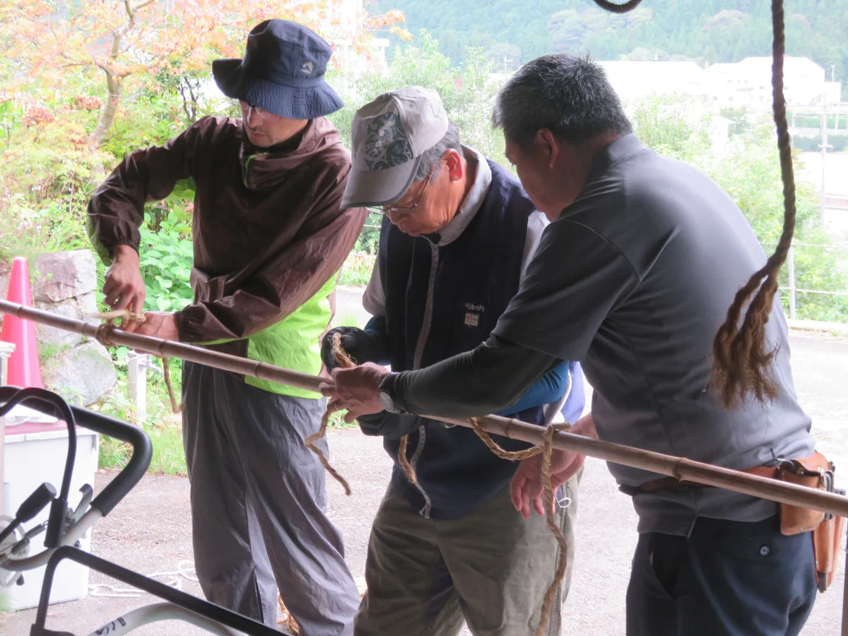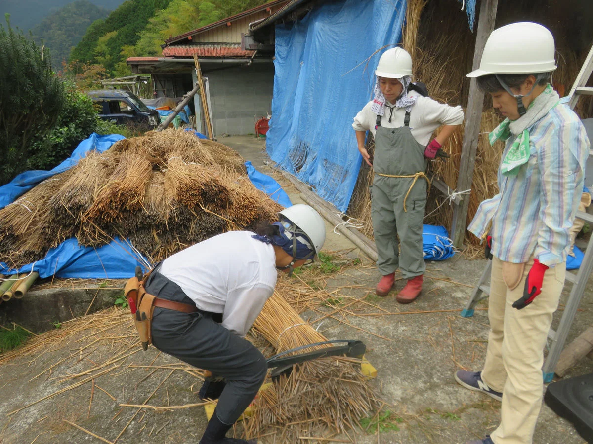 茅葺き葺き替え体験ワークショップを2週にわたって開催し、初参加を含めて5人が参加しました。紐の結び方、茅の切り方、屋根の上での作業など、基本的な作業手順を学びました。