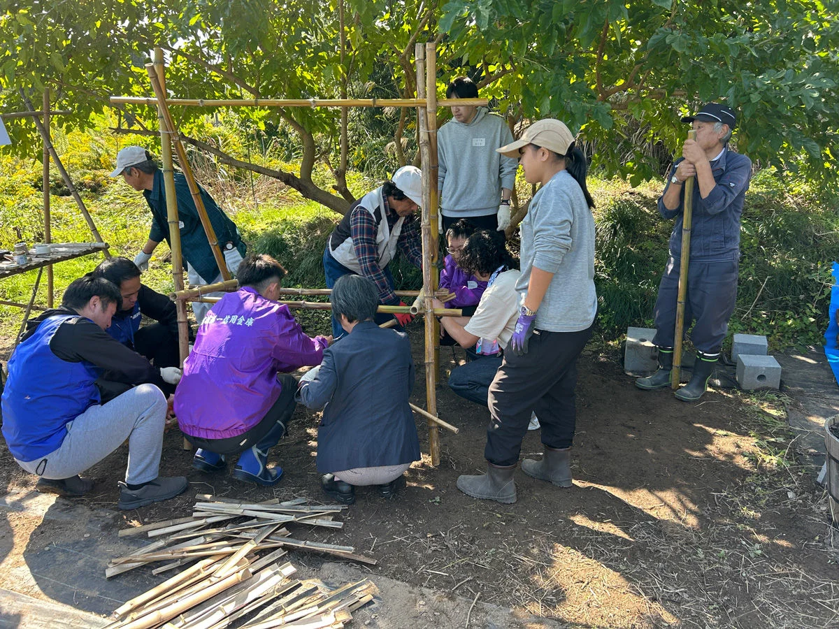 講師から伐採竹を有効活用する知恵を学び、参加者と協力して竈を組み立てました。