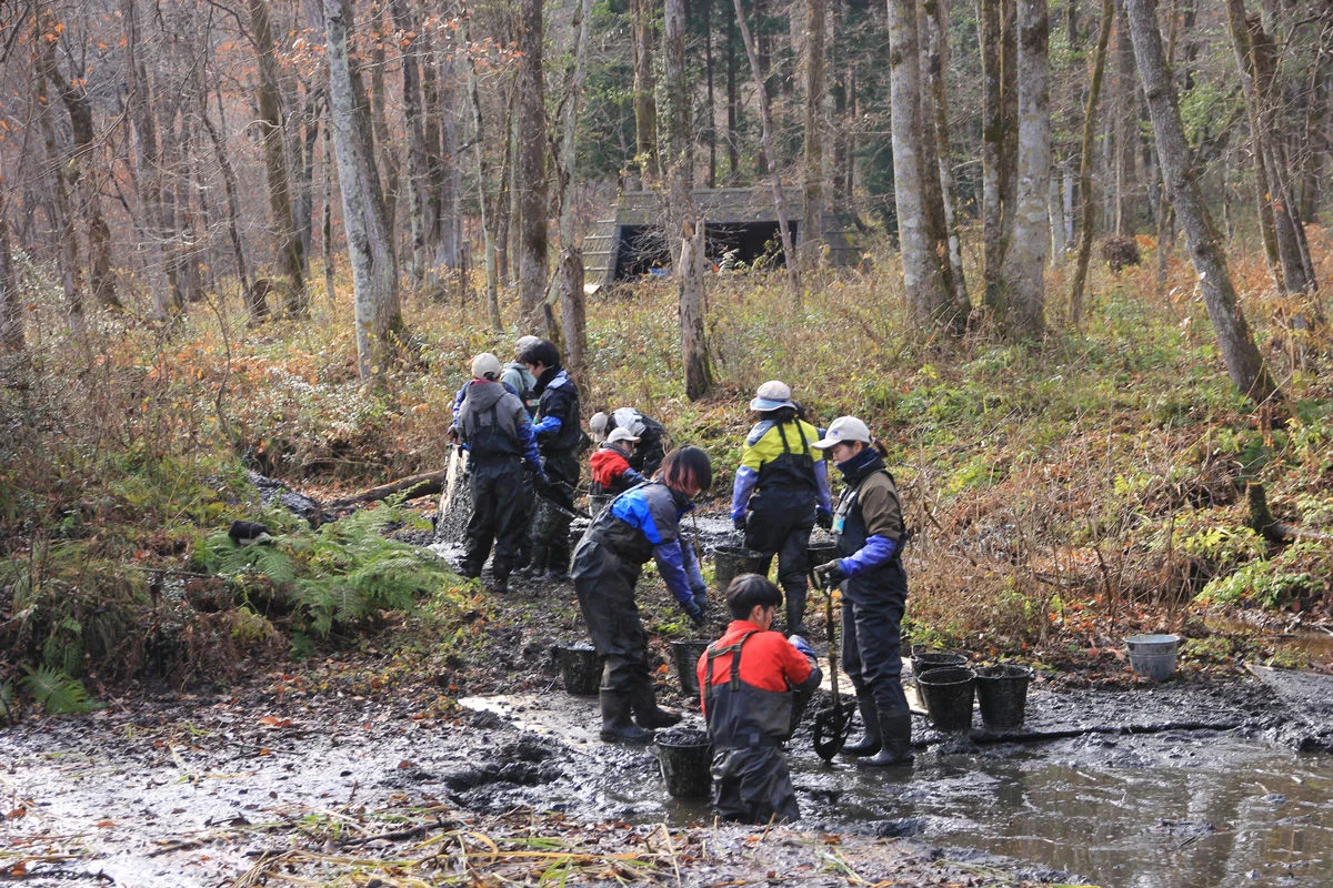 ボランティアの皆さんと一緒に、水の中に入りながらバケツリレーで泥を上げていき、池の環境を取り戻しました。