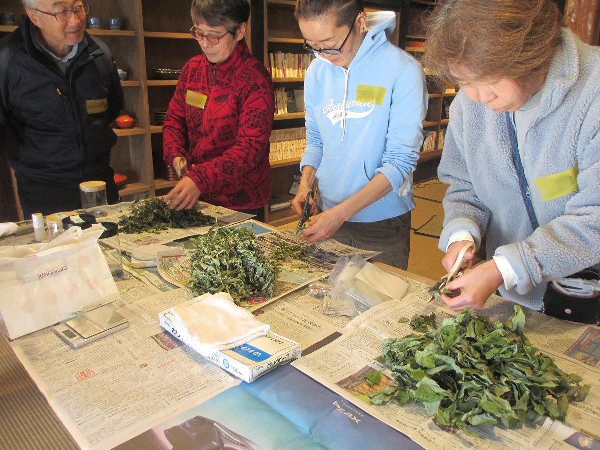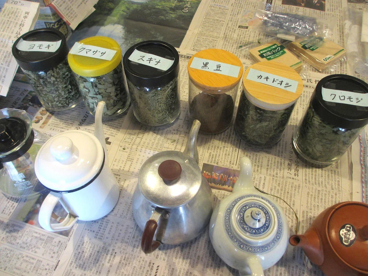 鬼無里で採取したヨモギ、クマザサ、スギナ、クロモジ、カキドオシを刻んで煎って、お茶にしました。