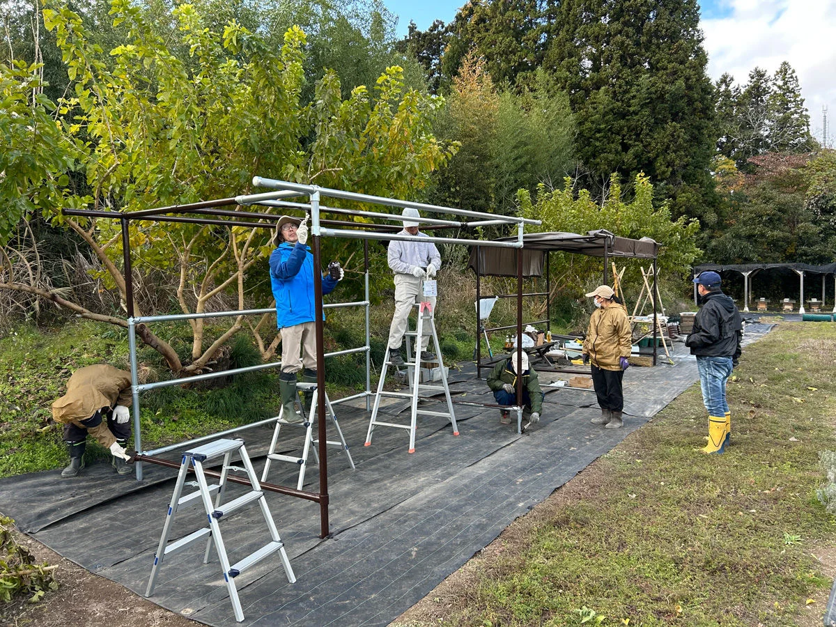 11月19日に「活動拠点DIY」を実施し、遊休農地に2つ目の日陰棚(パーゴラ)を設置しました。