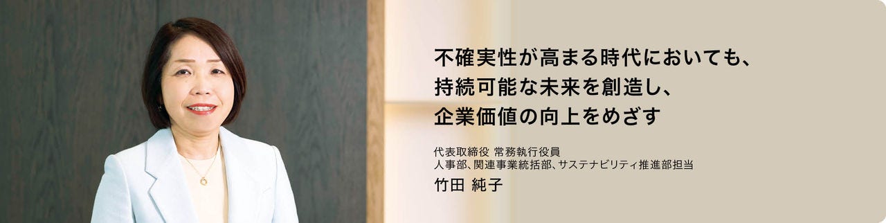 当社グループは、20年以上前からグループ理念に掲げる持続的発展(サステナビリティ)を企業経営の中心に置き、環境への取り組みを重視した経営を進めています。また、2024年には、これまでのブランドステイトメントに加えて、未来を見据えた6つの価値観(「誠実・共生・安全」&「挑戦・自発・進化」)を定め、新たなブランドフレームとして取り組みを進化させています。このグループ理念に基づく持続的な価値向上と発展の追求は、当社グループにおけるサステナビリティの根幹にほかなりません。取締役および執行役員がこのサステナブル経営を推進していくにあたり、2022年度よりESG目標への取り組みに対する評価も役員報酬に反映しています。