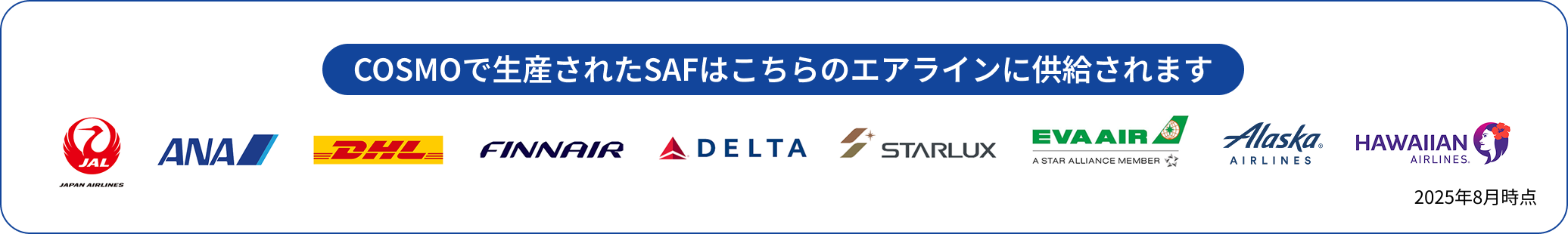 原料調達からSAF供給までの安定的なサプライチェーンの構築が普及のカギとなります。そのため、コスモエネルギーグループは、日揮ホールディングス株式会社、株式会社レボインターナショナルと共同で、新会社SAFFAIRE SKY ENERGYを設立し、原料となる廃食用油の調達から、SAFの製造・品質管理、航空会社への供給に至るまでのすべてのSAFサプライチェーンの構築を国内で実現しました。