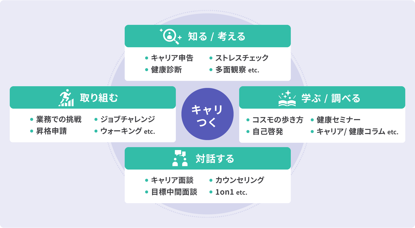 ※「キャリつく」:充実したキャリアをつくるために、自分のついて深く知り・考え、キャリアや健康を学び・調べて、将来について対話し、自己成長や健康増進に取り組むこと。