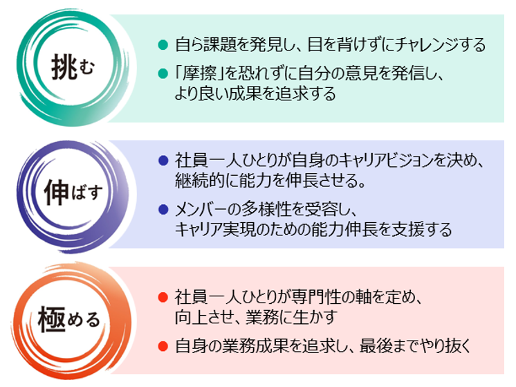 「Vision 2030」を実現するために、社員に求める人材要件「挑む」「伸ばす」「極める」を設定しています。